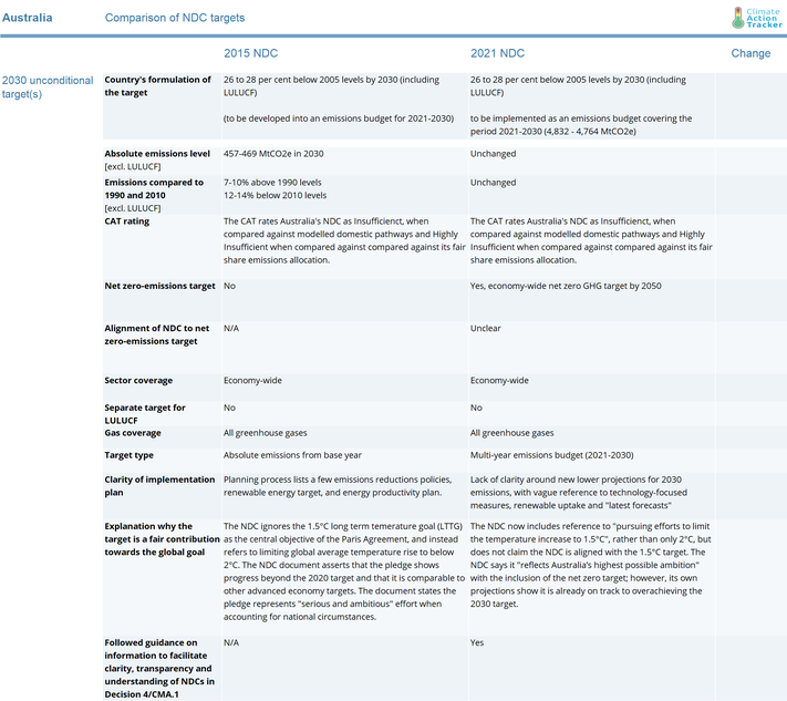 Australia submitted its updated NDC in October 2021. The update recommunicated Australia’s unchanged 2030 target it first submitted in 2015. The CAT rates this target as 'Highly insufficient' when compared to its fair-share emissions allocation and 'Insufficient' when compared to the emissions cuts that need to occur within Australia's borders.