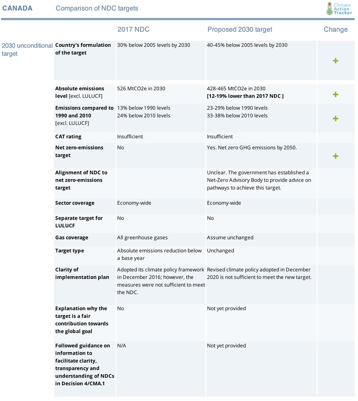 The new target is stronger than the range proposed by Prime Minister Justin Trudeau at last December’s Climate Ambition Summit - a 32-40% reduction below 2005 levels by 2030 (28-36% excl. LULUCF).