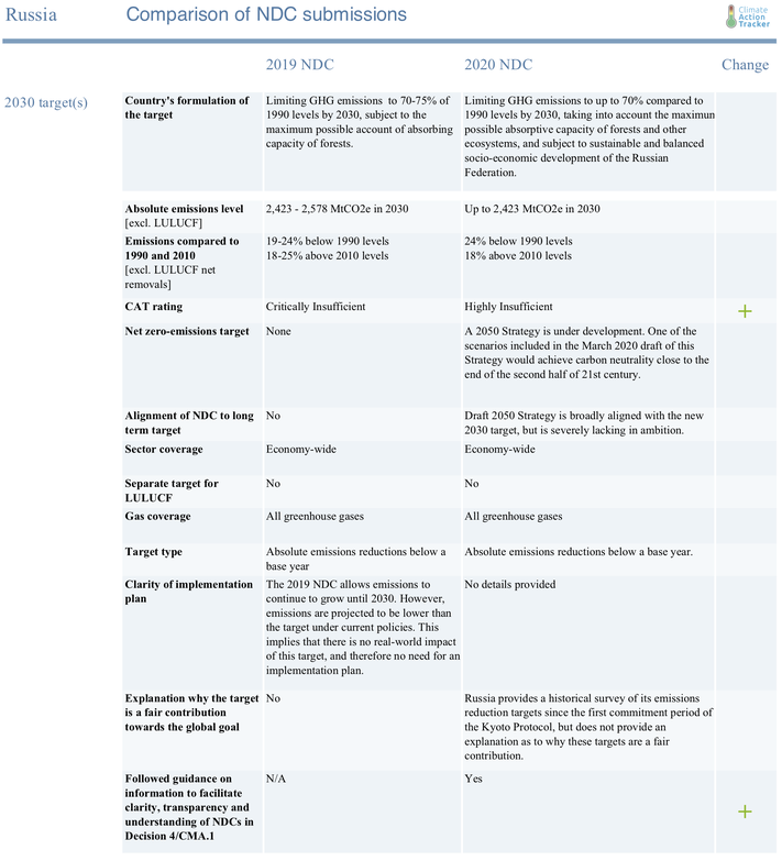 On 25 November 2020, Russia formally submitted its updated NDC target to the UNFCCC. The new target matches the one stipulated by the Presidential Decree signed by Russian President Vladimir Putin earlier in November; a reduction of at least 30% below 1990 levels, taking into account the maximum possible absorptive capacity of forests.