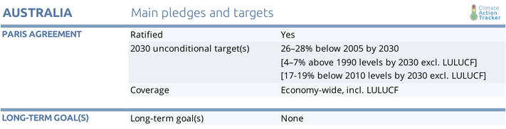 Australia’s emissions from fossil fuels and industry continue to rise, and are now 7% above 2005 levels. These emissions have increased by around 1% per year on average since 2014, the year in which Australia’s national carbon pricing scheme was repealed. Under current polices, these emissions are headed for an increase of 8% above 2005 levels by 2030, rather than the 14-17% decrease in these emissions required to meet Australia’s Paris Agreement target (excluding LULUCF). This means Australia’s emissions are set to far outpace its “Insufficient” 2030 target.