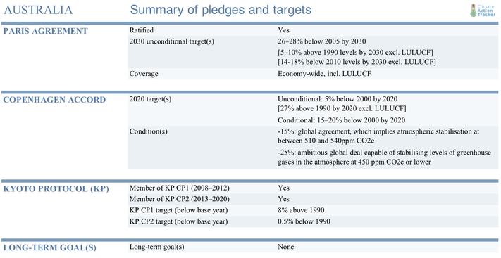 Under the Copenhagen Accord Australia proposed three targets for 2020 with different conditions, 5%, 15%, and 25% below 2000 levels. The 5% below 2000 levels goal currently stands as Australia’s unconditional pledge. In its Copenhagen Accord Australia pledges “to reduce its greenhouse gas emissions by 25% on 2000 levels by 2020 if the world agrees to an ambitious global deal capable of stabilising levels of greenhouse gases in the atmosphere at 450 ppm CO2eq or lower”—with the Paris Agreement long-term temperature goal this condition has been met.