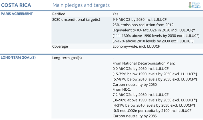 Costa Rica has had high aims on climate for the last ten years, but its policies are still catching up. According to our analysis, under a pathway following its current NDC commitments, Costa Rica would only achieve carbon neutrality in 2085. However, if Costa Rica were to implement all the new policies in its new Decarbonisation Plan, it could achieve carbon neutrality 35 years earlier, i.e. by 2050. For full details see pledges and targets section.