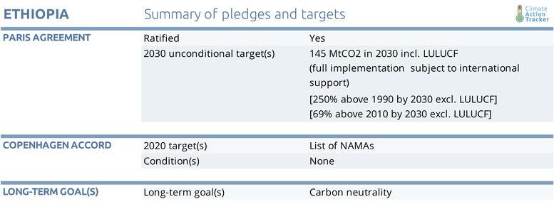 In the long term Ethiopia intends to become carbon neutral (The Federal Democratic Republic of Ethiopia, 2015). Ethiopia is in the process of developing a long-term strategy under the 2050 pathway platform – once this is submitted we will revise the 2050 target accordingly.