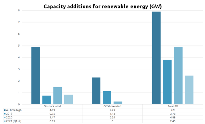 From 2019, solar PV installations underwent a significant increase, with almost 4 GW of newly- installed capacity in 2019, 5 GW in 2020 and 2.5 GW added in the first half of 2021 (Fraunhofer ISE, 2021b). Offshore wind installations peaked at 2 GW in 2015, then dropped significantly and have come to a complete stop in the first half of 2021 (Fraunhofer ISE, 2021b). Onshore wind installations peaked at 5 GW in 2017, have significantly dropped in 2019 (0.75 GW), but picked up again in 2020 with 1.47 GW of capacity added and stood at 0.83 GW in the first half of 2021 (Fraunhofer ISE, 2021b).