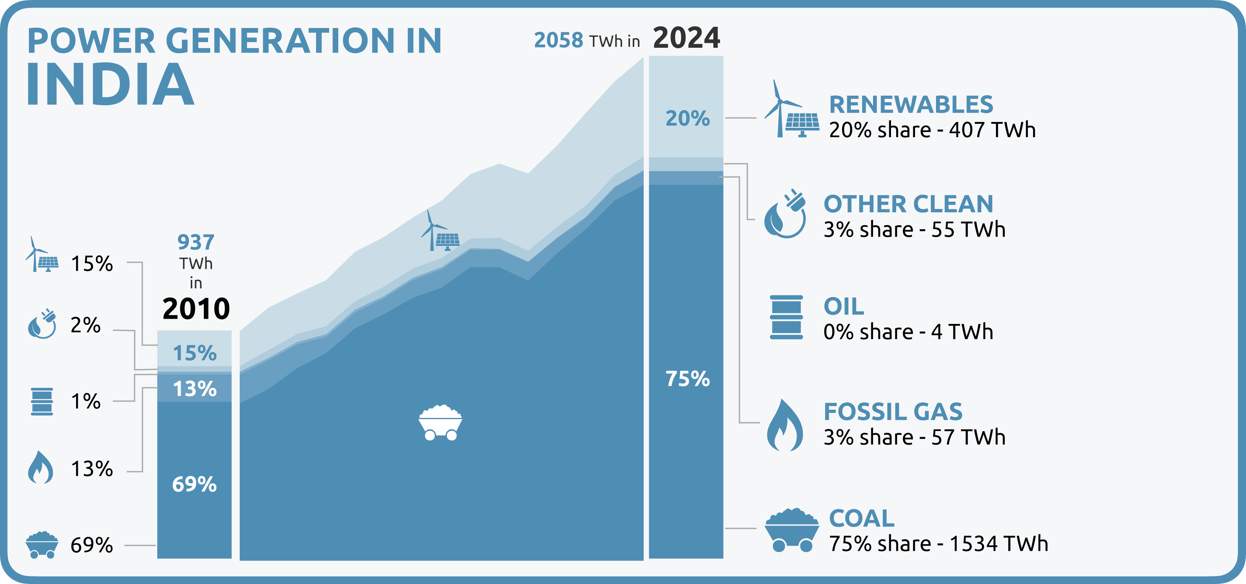 With extreme heat pushing electricity demand to record highs, coal power generation also reached a new record of 122 TWh in May 2024, leading to a steady increase in power sector emissions (Ember, 2025a). In 2024, power plants consumed a total of 875 million tonnes of coal, marking a significant increase from the 835 Mt consumed in 2023 (Ministry of Power, 2025).