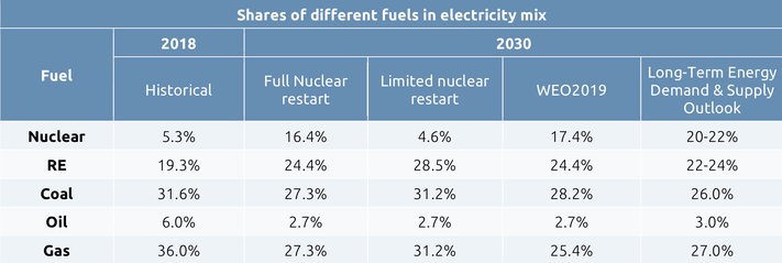 The range of the projections depends partly on the future of nuclear power. The lower end projection is from a scenario in which all nuclear reactors that applied for restart as of November 2019 would be approved and the difference in nuclear power generation compared to the IEA WEO 2019 Current Policies Scenario (IEA, 2019) is balanced by coal and gas power.