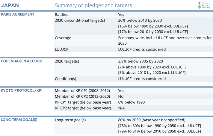 Japan’s NDC includes an emissions reduction target of 26% below 2013 levels in 2030 (Government of Japan, 2017), which translates to a 18% reduction from 1990 levels, excluding LULUCF in the base year, but including LULUCF credits in the target year. The target contains 37 MtCO2e/year of credits from LULUCF in 2030. A large share will come from forest management, as was the case for Japan’s pre-2020 targets—this reduces the effectiveness of the target.