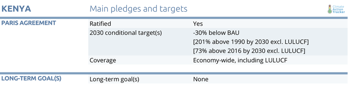 Kenya’s Paris Agreement target is one of the few that the Climate Action Tracker rates as “2°C compatible”. This rating indicates that Kenya’s current policies are within the range of what is considered to be a fair share of global effort; however, these plans are not yet consistent with the Paris Agreement.