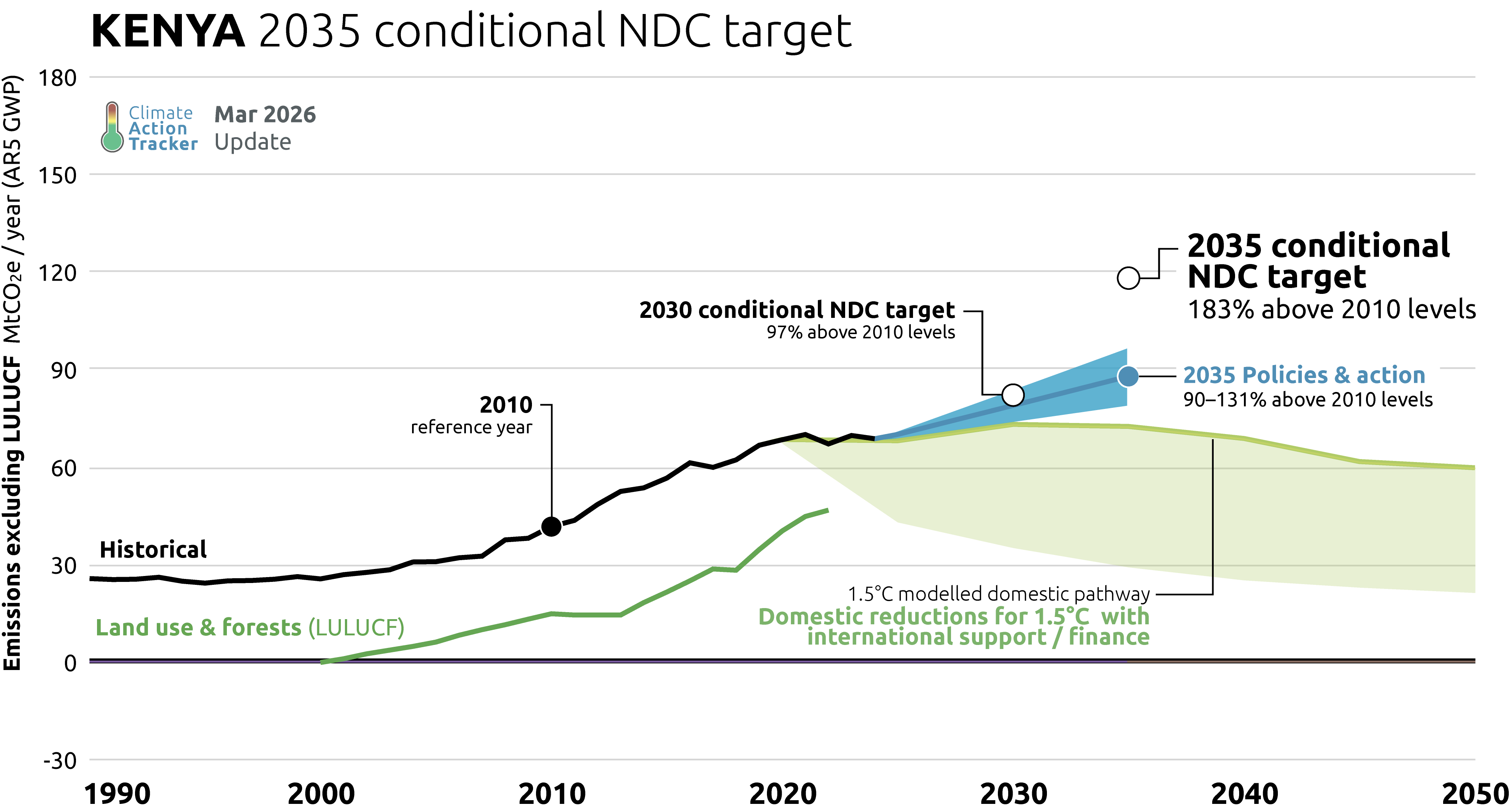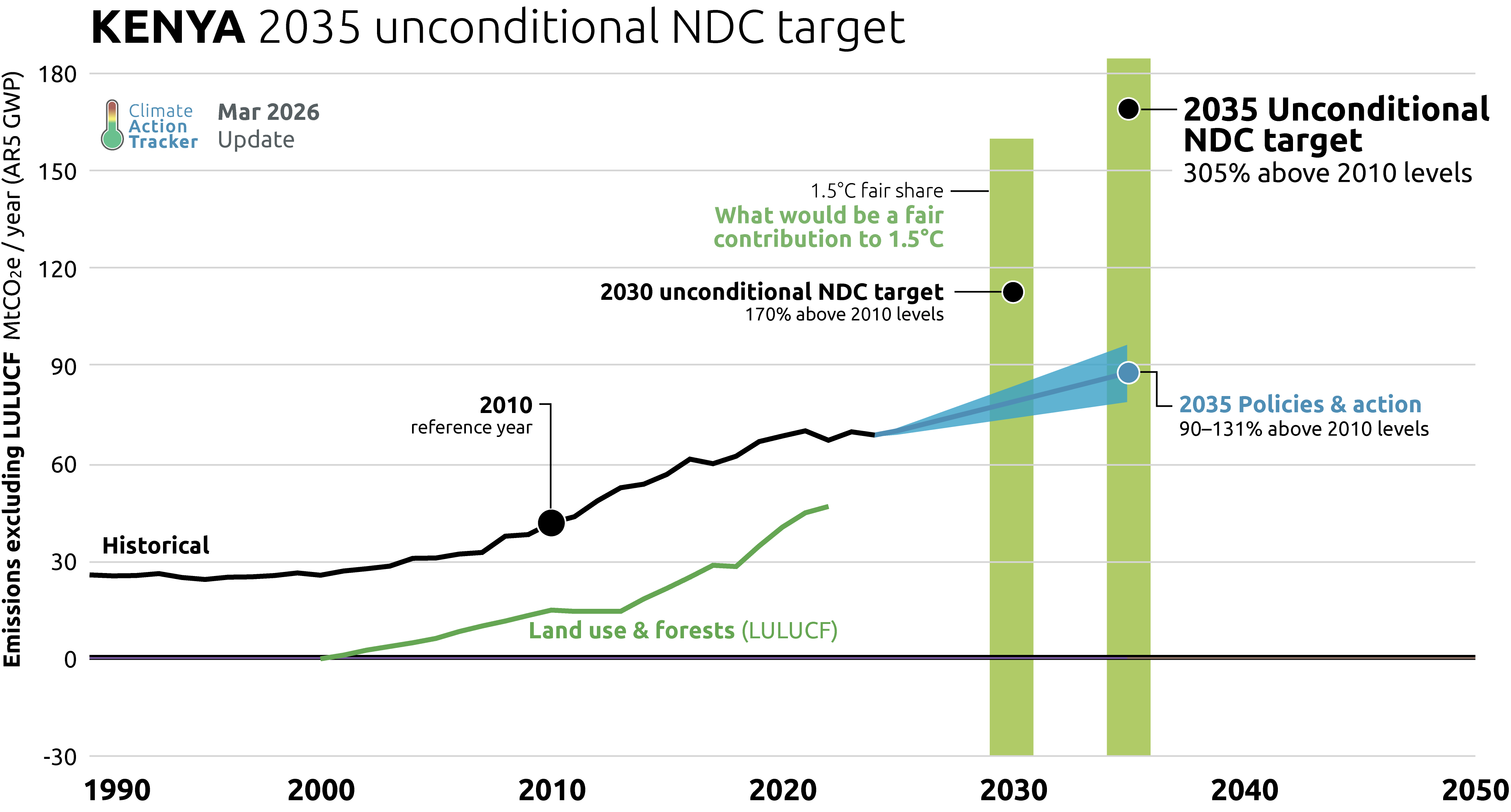Kenya's new 2035 NDC commits to a 35% reduction in emissions by 2035 below business as usual (BAU) scenario. In absolute terms, emissions under this NDC would rise significantly, exceeding current policies.