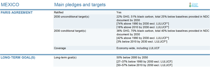 The Climate Action Tracker rates Mexico’s NDC target as “Insufficient.” This means that Mexico’s climate commitment in 2030 is not consistent with holding warming to below 2°C, let alone limiting it to 1.5°C as required under the Paris Agreement, and is instead consistent with warming between 2°C and 3°C.