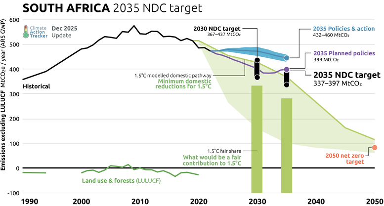 South Africa's 2035 NDC targets continue the historical trend of declining emissions and are lower than the previous 2030 target range. But the level of ambition has not substantially increased from the 2030 NDC, with the new targets being less compatible with a 1.5˚C aligned pathway than the 2030 targets. The country has seen declining emissions in recent years and the government is in the process of implementing improvements to climate policies and governance. Yet implementation gaps are apparent: the phase-out of coal in the country’s power sector has faced major delays from previously communicated timelines and the implementation of decarbonisation measures in buildings, transport and industry is slow.