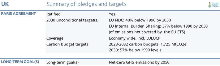 As a member of the EU, the UK is obliged to contribute to the EU-wide NDC agreed to under the Paris Agreement of a 40% reduction in GHG below 1990 levels by 2030. Under the EU’s Effort Sharing Regulation, UK sectors not covered by the EU Emissions Trading Scheme (ETS) are required to reduce GHG emissions by 37% below 2005 levels by 2030. This includes the transport and agriculture sectors, which made up 38% of the UK’s overall emissions in 2017 (UK Government, 2019a).