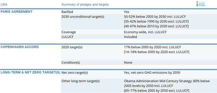 The new NDC target represents major progress beyond the previous US target of 26%–28% below 2005 levels by 2025 (Obama-era) but is not quite enough to bring US domestic emissions in line with what would be needed to achieve the Paris Agreement’s 1.5°C limit.