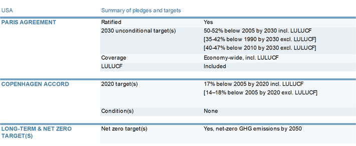 President Biden moved to re-join the Paris Agreement on his first day in office. In line with its re-joining, on 22 April 2021 the US submitted a strengthened Paris Agreement target - a Nationally Determined Contribution (NDC) – of reducing emissions by 50%–52% below 2005 levels by 2030, including land-use, land-use change and forestry (LULUCF).