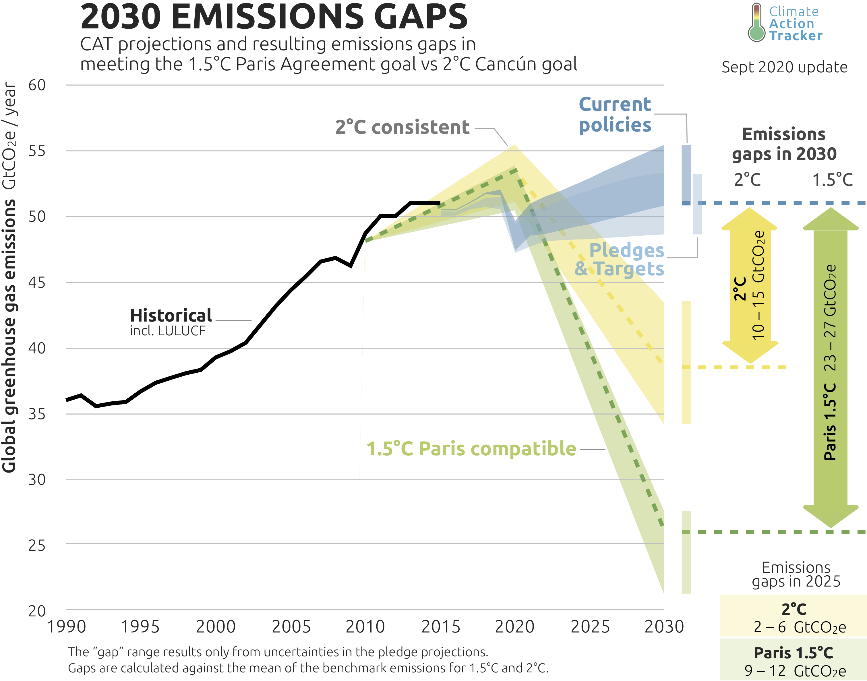 The benchmark emissions from a 1.5°C compatible pathway are 40 GtCO2e in 2025 and 26 GtCO2e in 2030. Comparing these with the emissions from the pledges and targets submitted by September 2020, which results in total global emissions of 48–52 GtCO2e in 2025 and 49–53 GtCO2e in 2030 the CAT calculates a gap 9–12 GtCO2e in 2025 and 23–27 GtCO2e in 2030.