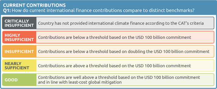 - Current contributions: measures the level of international climate finance provided since Paris and compares it to a benchmark associated with the country’s fair share. This is the most significant component of the CAT climate finance rating since it considers the absolute amount of finance provided for mitigation. This component does not account for the effectiveness of the finance provided.