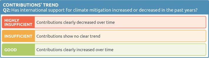 - Contribution trend: measures whether international climate finance provided has increased in the last five years. Overall climate finance needs to be scaled up. This component measures whether a government’s financial contributions develop in the right direction. However, this component does not compare the country’s trend against a ‘good practice’ benchmark for increase.