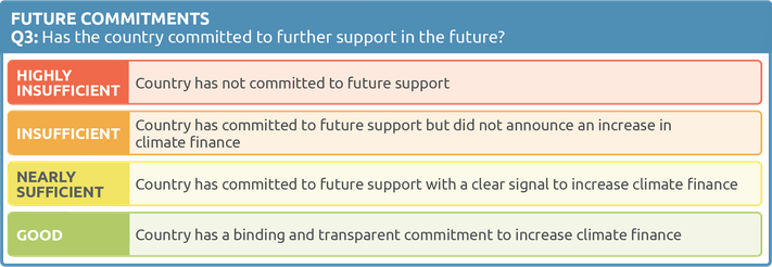 - Future commitments: evaluates a government’s future commitments and pledges, if any exist, in terms of their transparency and reliability. The previous components looked at past contributions. This component rates a government’s future commitments. It captures more recent developments, that are still not reflected in the government’s realised contributions. It also captures intentions to scale up climate finance. This component is important but represents a smaller share of the CAT finance overall rating. Once these commitments are realised they will be reflected in the current contributions component.
