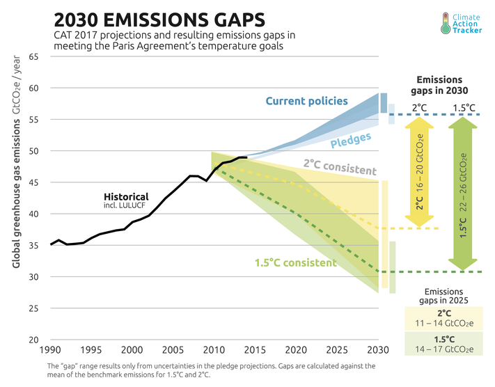Although the 2030 emissions gap between current policies and Paris Agreement compatible emission pathways has narrowed, the NDC commitment gap has widened slightly, as shown in the table above, primarily due to US inaction.
