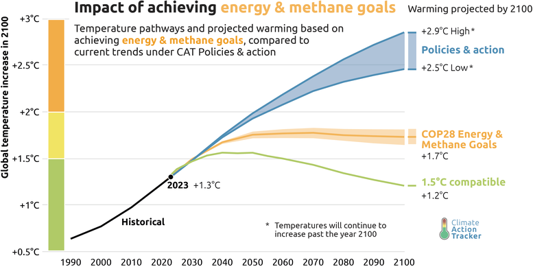 "In the ten years since Paris our outlook of warming by the end of the century improved by 1˚C, but emissions until 2030 keep stubbornly high. Tripling renewables, doubling efficiency and action on methane would significantly lower emissions by 2030 and if continued keep warming below 2°C" said Prof. Niklas Höhne of CAT partner organisation NewClimate Institute.