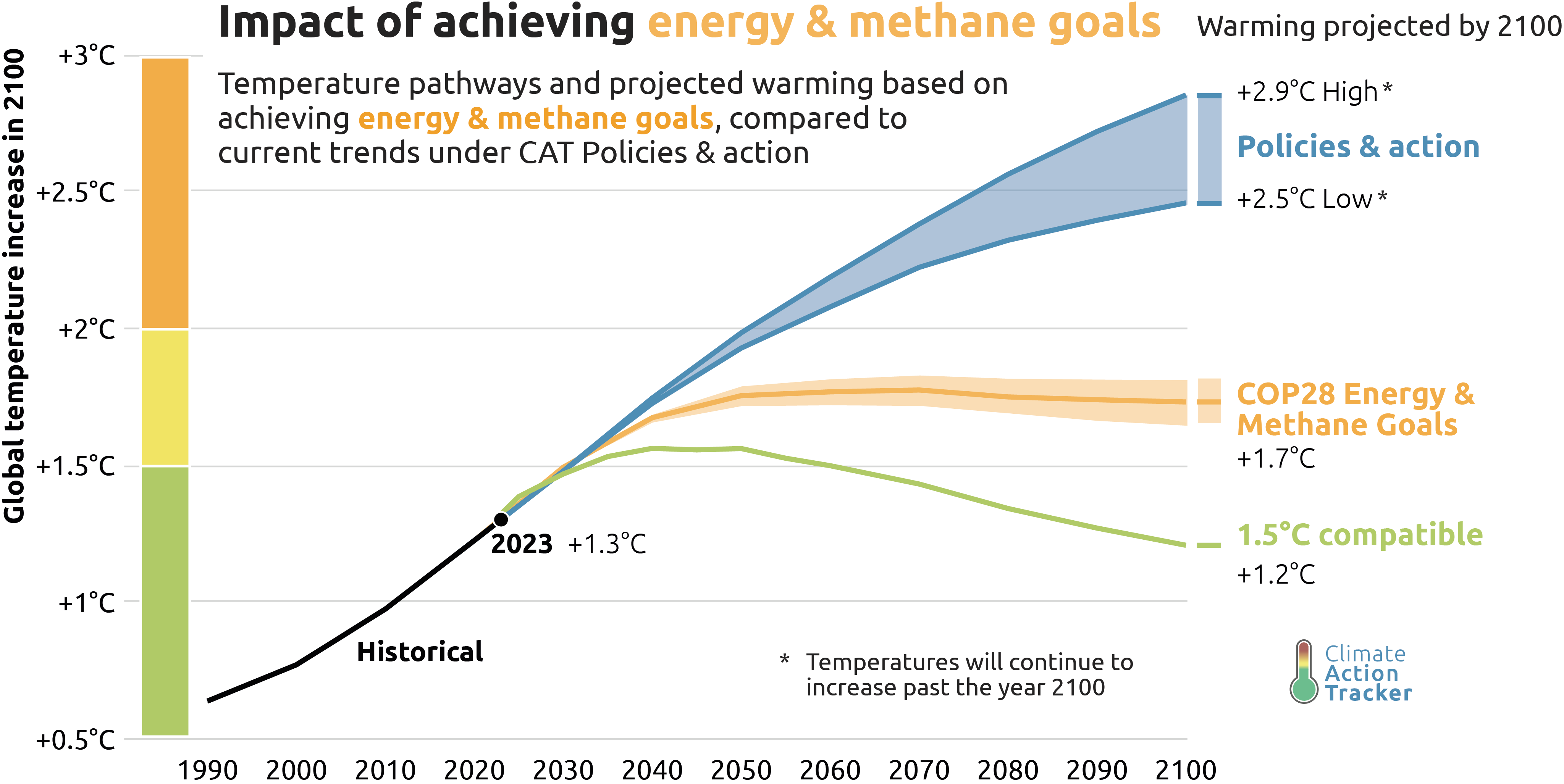 The analysis evaluates the global benefits of governments taking concerted action to deliver on the COP28 Energy and Methane Goals by 2030 and 2035, both in terms of emission trajectories and warming implications.