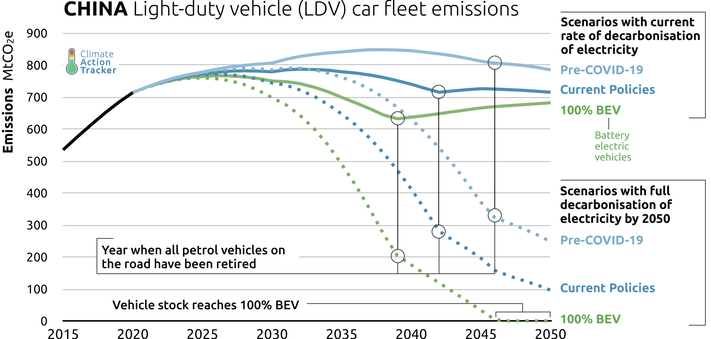 For China to achieve its long-term carbon neutrality goal by 2060, achievement of a 100% BEV vehicle stock is required, along with power sector decarbonisation.