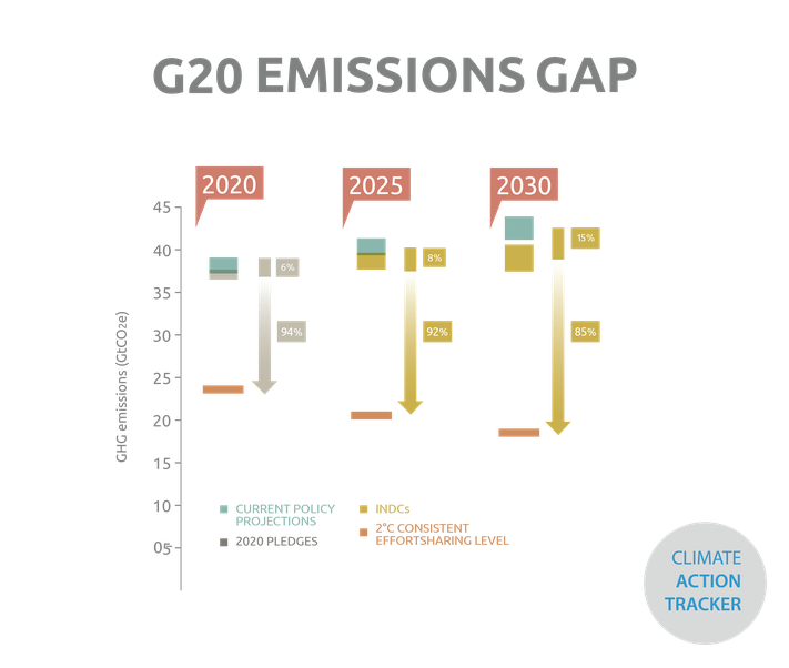 None of the G20 INDCs are in line with holding warming below 2°C, or 1.5°C. Taken together, the CAT finds that a very large emissions gap remains.