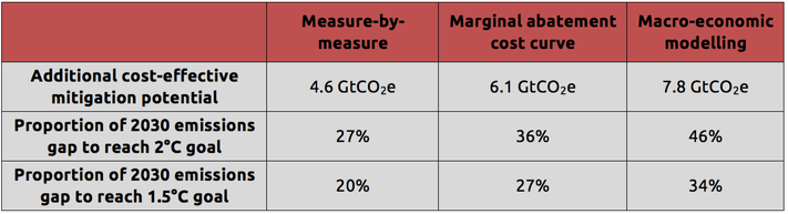 - Our result show that the emissions gap in 2030 between governments’ INDCs and the 2°C temperature goal, currently around 17 GtCO2e,could be closed by 4.6 – 7.8 GtCO2e or 27-46%, without imposing additional economic burdens on those undertaking the additional effort.