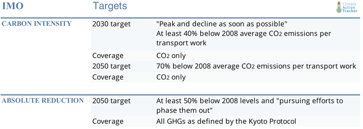The CAT rates the 2030 and 2050 carbon intensity targets as ‘highly insufficient’, indicating that the target is consistent with limiting warming to between 3°C and 4°C if all other sectors were to follow the same approach as international shipping. It is important to note that the 2030 carbon intensity target is highly dependent on projected demand. Our target calculations are based on demand projections as provided by the IMO 4th GHG study. See assumptions sections for more details.