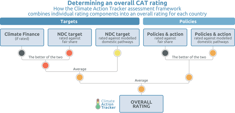 Country targets are rated as a package – we combine the two target ratings (domestic or internationally supported target and the fair share target) by averaging. For countries with a climate finance rating, we first combine the fair share target rating and climate finance rating – a good climate finance rating can help to improve the fair share target rating.