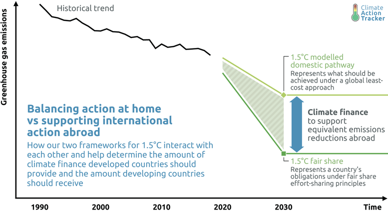 The CAT’s fair-share levels and modelled domestic pathways provide a guide as to what is needed or expected from each country in terms of domestic mitigation and overseas support. A country could choose to go beyond its 1.5°C modelled domestic pathway and would thereby reduce the total finance it would be expected to provide.