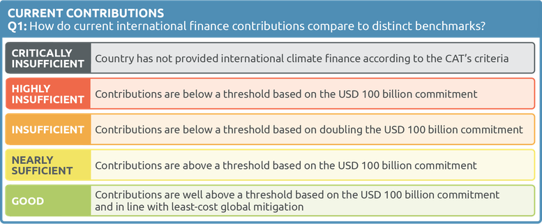 - Current contributions: measures the level of international climate finance provided since Paris and compares it to a benchmark associated with the country’s fair share. This is the most significant component of the CAT climate finance rating since it considers the absolute amount of finance provided for mitigation. This component does not account for the effectiveness of the finance provided.