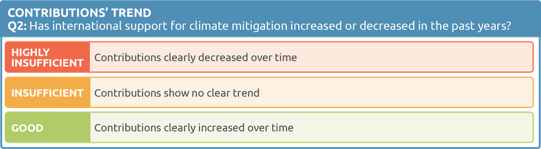 - Contribution trend: measures whether international climate finance provided has increased in the last five years. Overall climate finance needs to be scaled up. This component measures whether a government’s financial contributions develop in the right direction. However, this component does not compare the country’s trend against a ‘good practice’ benchmark for increase.