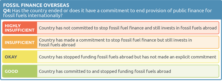 - Fossil fuel finance overseas: investigates whether countries provide support for fossil fuels abroad. Fossil fuel finance clearly undermines international climate finance efforts. The construction of coal-fired power plants or support for the development of fossil fuel extraction is at odds with the goals of the Paris Agreement. The CAT also considers this in its climate finance rating.