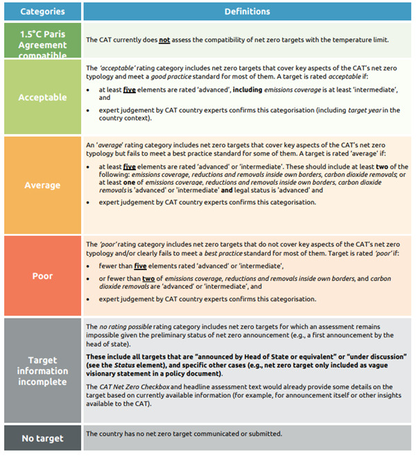 The headline evaluation aims to categorise existing net zero targets into broad categories to distinguish their level of comprehensiveness and, where possible, level of ambition. The headline evaluation explicitly does not assess whether a net zero target is aligned with the Paris Agreement’s 1.5°C temperature limit.
